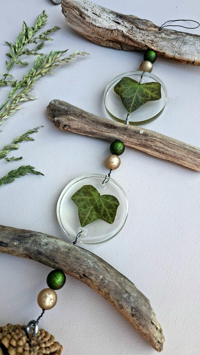 Material: Gefallene Äste aus dem Wald, Rondellen aus Epoxidharz, getrocknete Efeublätter, Tannenzapfen und Polaris-Perlen